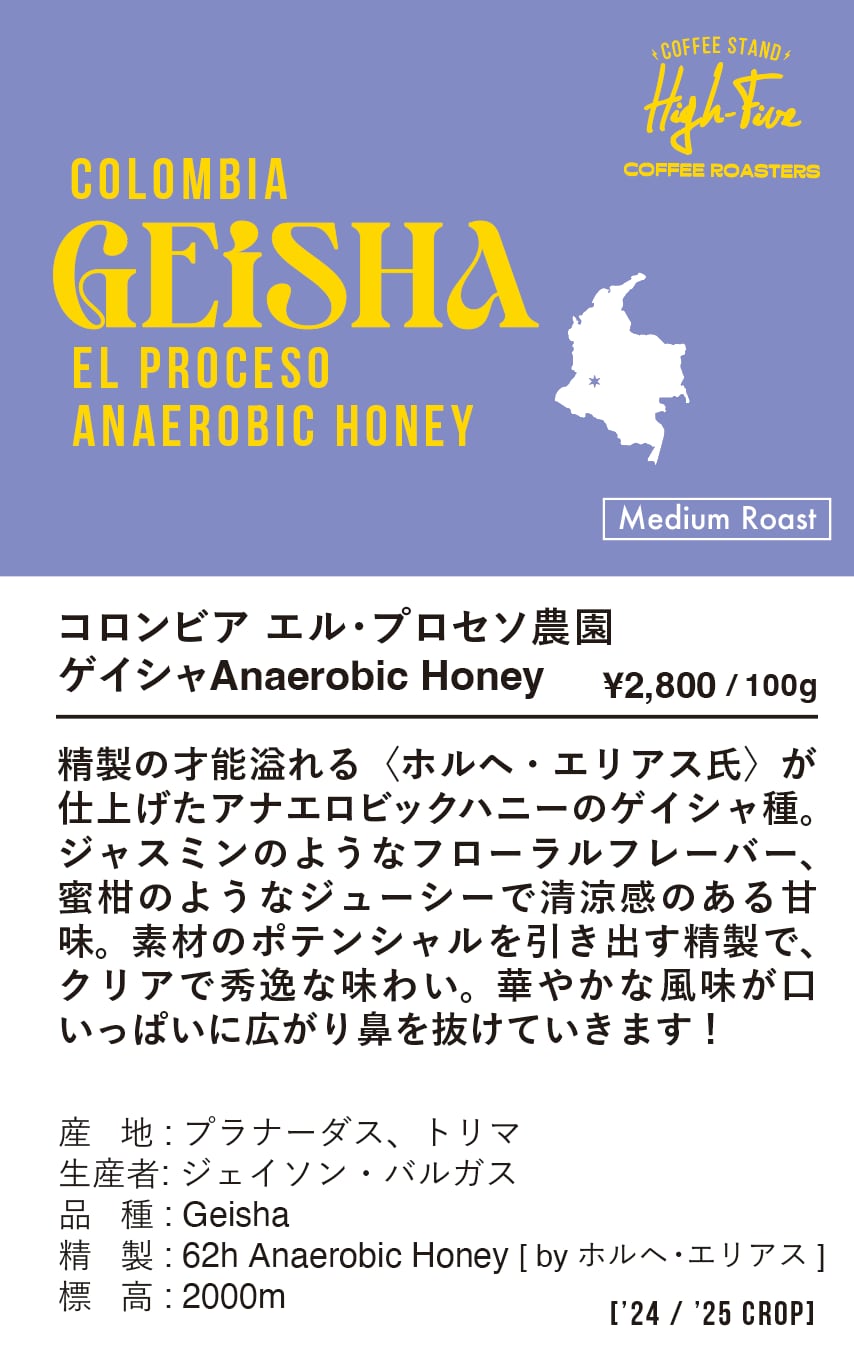 コロンビア ゲイシャ Anaerobic Honeyエルプロセソ農園/ 珈琲豆100g