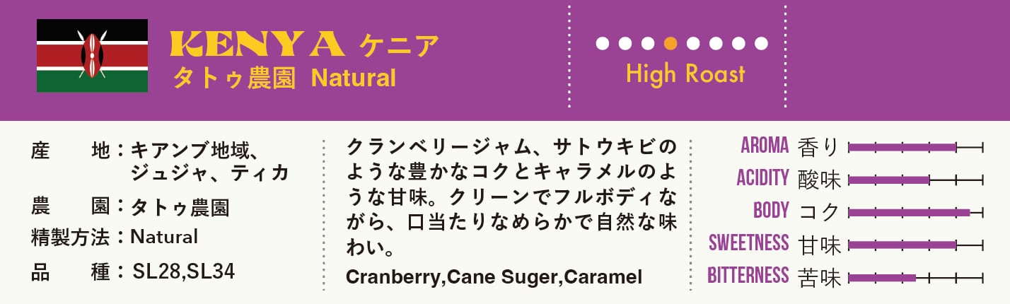 コーヒーの精製処理もより複雑化する昨今で、より洗練された「ナチュラル製法」も新たに取り入れる生産者も増えてきています。そしてナチュラルのコーヒーは力強いボディやファンキーなアロマなどが特徴的でありますが、こちらのタトゥ、ケニアはクリーンなフレーバーが美しく感じられます。それでいて、ウォシュドにはない複雑味を醸し出しています。
